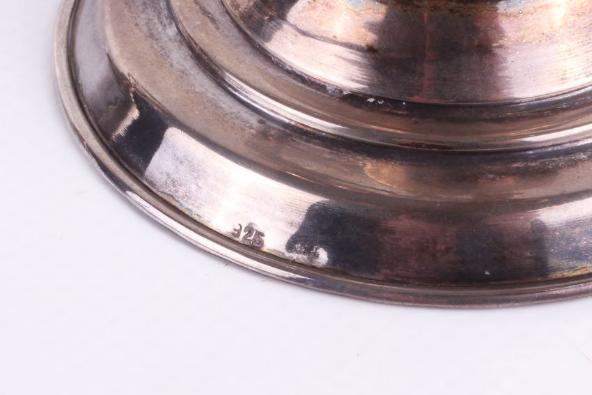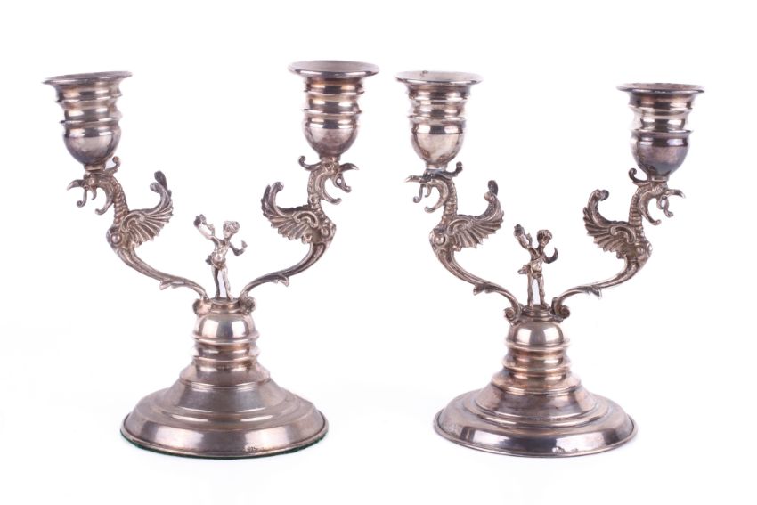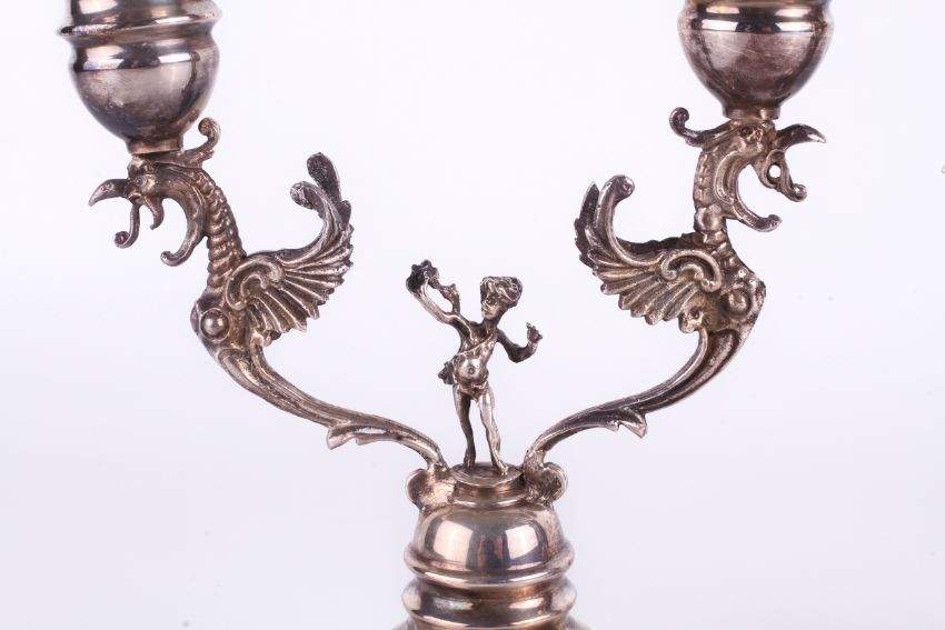 A pair of continental 925 silver double candlesticks. Each with a pair of phoenix in flight flanking a young figure holding a scarf aloft, over a stepped round weighted base. Stamped 925 to base. H14.5cm.