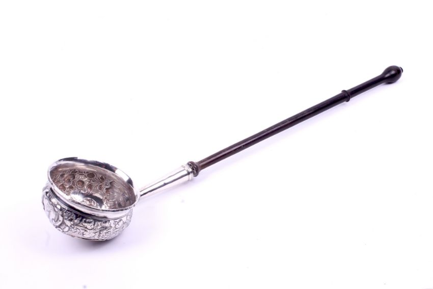 A white metal toddy ladle. Having embossed vine decoration and an etching of a bull, the base constructed of a 1714 Queen Anne Milled Silver Half Crown. With a turned wooden handle, L30cm