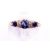 A yellow metal dress ring. Set with three faceted sapphires of 0.75 carats estimated total weight accented with two single cut diamonds and two synthetic white stones. Metal not marked, tested as approximately 18ct gold. Size M/N. 3.13g gross