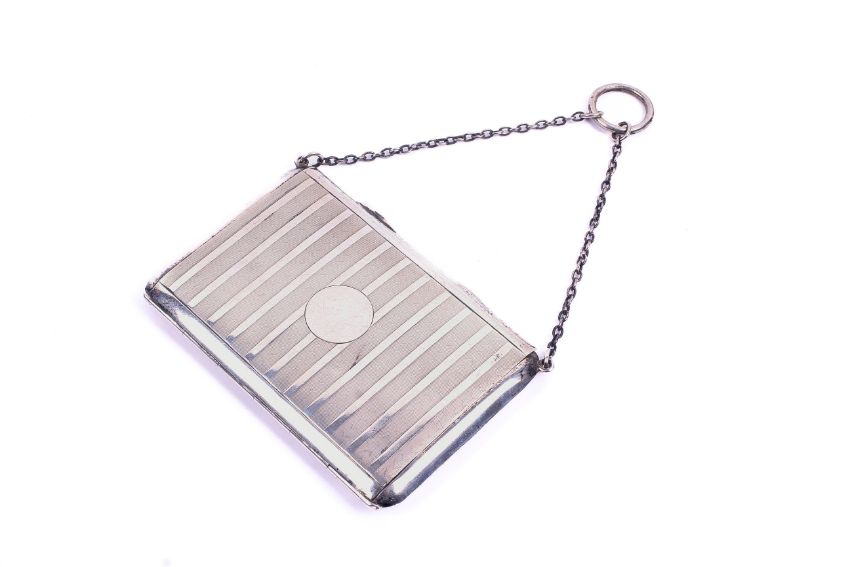 A Lady's sterling silver evening purse. Hallmarked Chester, circa 1990. Measuring 10.7cm x 7cm with chain fitting. Sprung opening mechanism. Gross weight 97.0 grams.