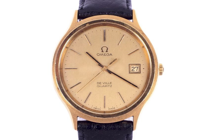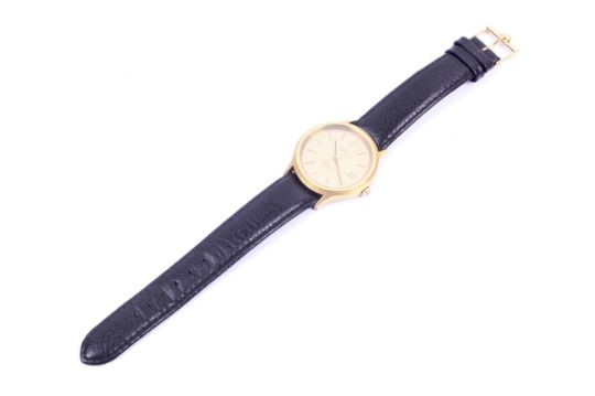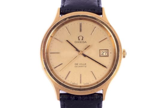 An Omega De-Ville gentlemans wrist watch. Quartz movement. The gilt dial having baton hour marks and a date aperture, in a gold plated case, case diameter 34mm. On a black leather strap with an Omega buckle