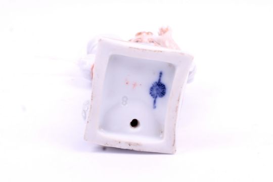 A pair of late 19th century porcelain miniature figures, Aelteste Volkstedt, Germany. Depicting two young boys in brightly patterned suits, one carrying his flower-filled hat, the other with his cap filled with flowers raised over his shoulder. Largest H10.5cm.