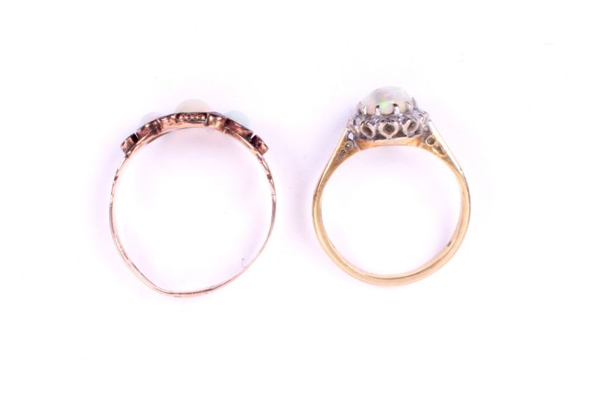 Two 20th century opal set gold dress rings. One hallmarked 9ct gold, size P, 1.7g gross. The second a cluster ring marked '18ct', size J, 2.7g gross. The opals scuffed/damaged.