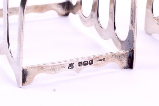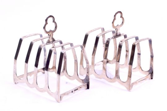 A pair of George VI silver toast racks. Cooper Brothers & Sons Ltd, Sheffield 1947, each having four sections and a pierced handle to the top, L7cm, 75.5g