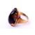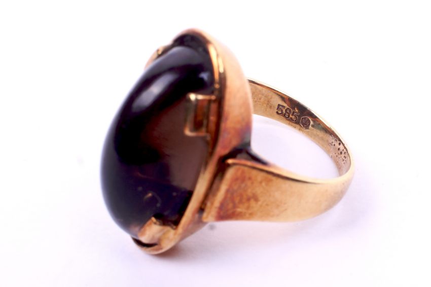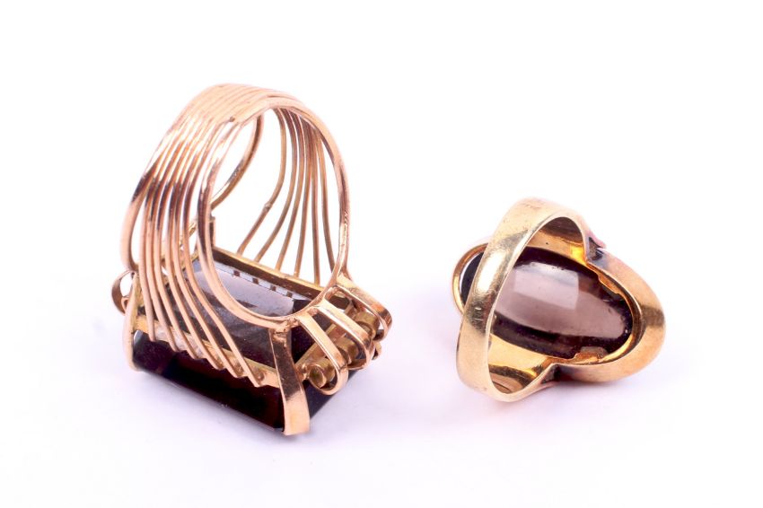 Two stone set yellow metal rings. Each set with semi precious material assessed as brown quartz. Tested as minimum 9ct yellow gold. One having an emerald cut stone size P, the other with an oval stone size K, 20.3g gross