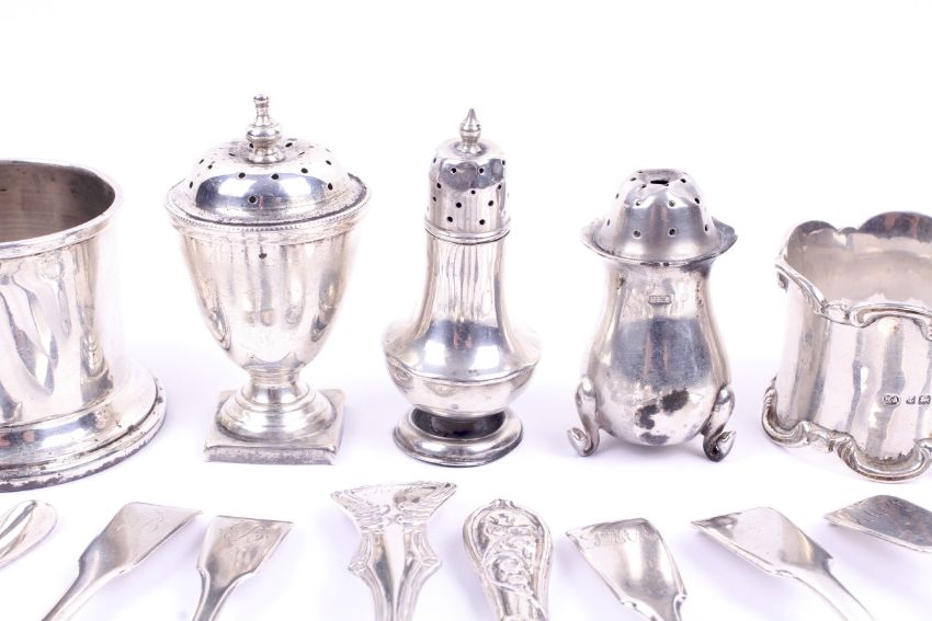 A small collection of hallmarked silver including three George III teaspoons. Including cruet pieces, spoons, one unmarked pickle fork, a napkin ring, etc. Total weight 356.7g.