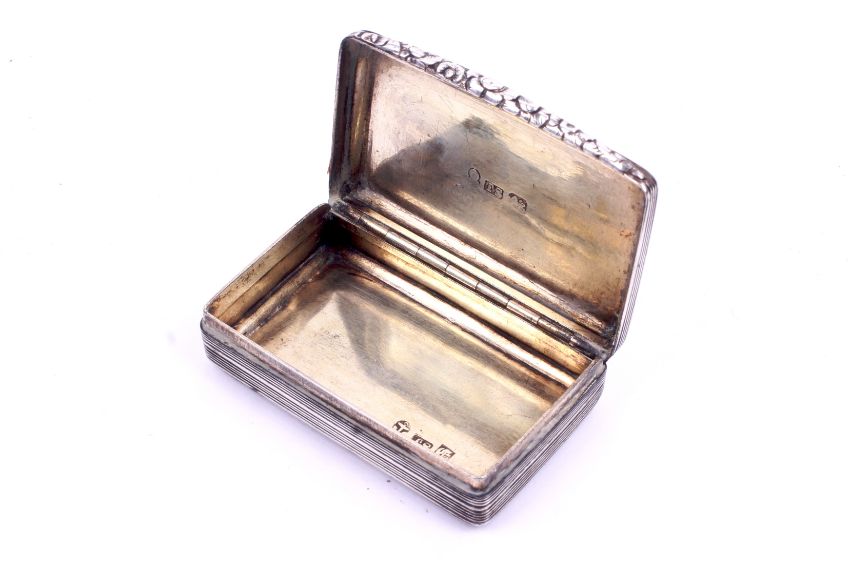 A George IV snuff box. Marked Birmingham 1828, rectangular with engine turned decoration and a moulded floral rim, L6cm, 48.1g
