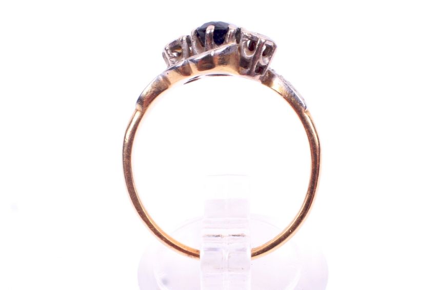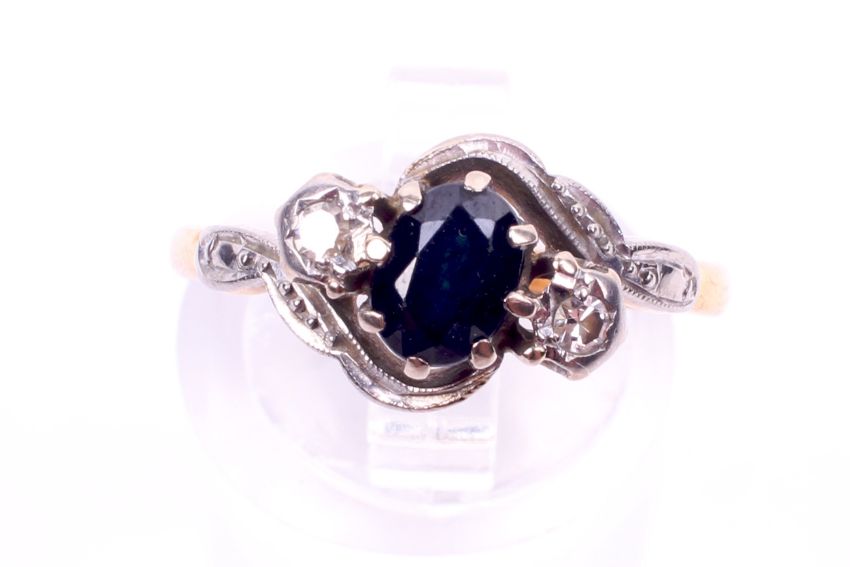 An 18ct gold sapphire and diamond dress ring. Set with one oval cut sapphire of 0.75 carats estimated weight and two single cut diamonds. Crossover scroll shoulders to a D section shank. Size P, 3.6g gross