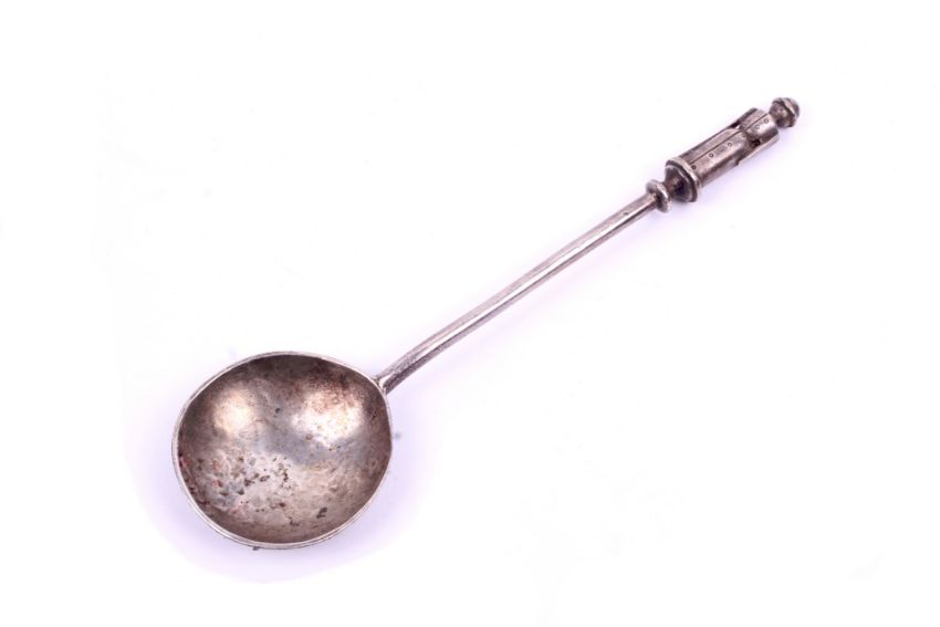 A silver spoon with finial modeled as a peg doll. Hallmarks for William Hutton & Sons Ltd, Sheffield 1912. Length 15.7cm, weight 48.8g.