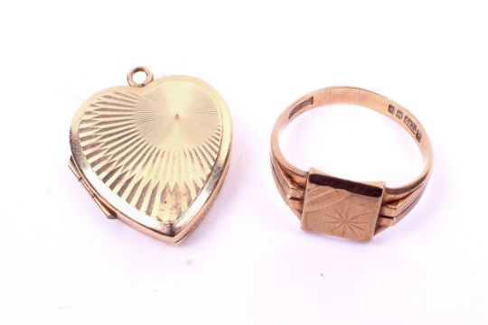 A 9ct gold signet ring and 9ct gold heart shaped locket. The ring having a rectangular panel, size M/N, 2.8g. The locket containing a lock of hair, L27mm, 2.8g gross