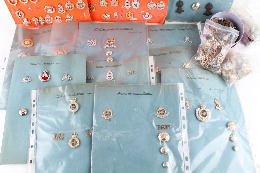 A collection of medal bars, miniature medal emblems and cap badges. Including Radfan, Burma, Borneo, Umbeyla, oak leaves, etc, some re-strikes.