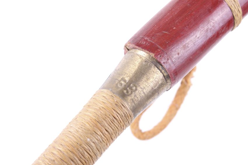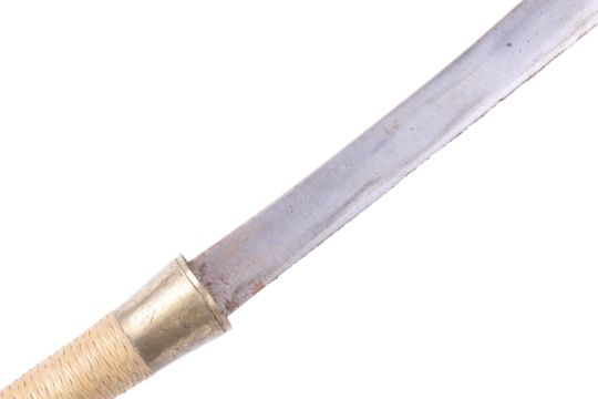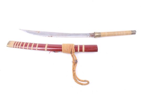 A 20th century Mandau sword and scabbard. The steel blade engraved with script, the wooden handle wrapped in string and mounted in brass, the upper handle impressed '63', the scabbard constructed on wood with brass mounts, sword 57cm long