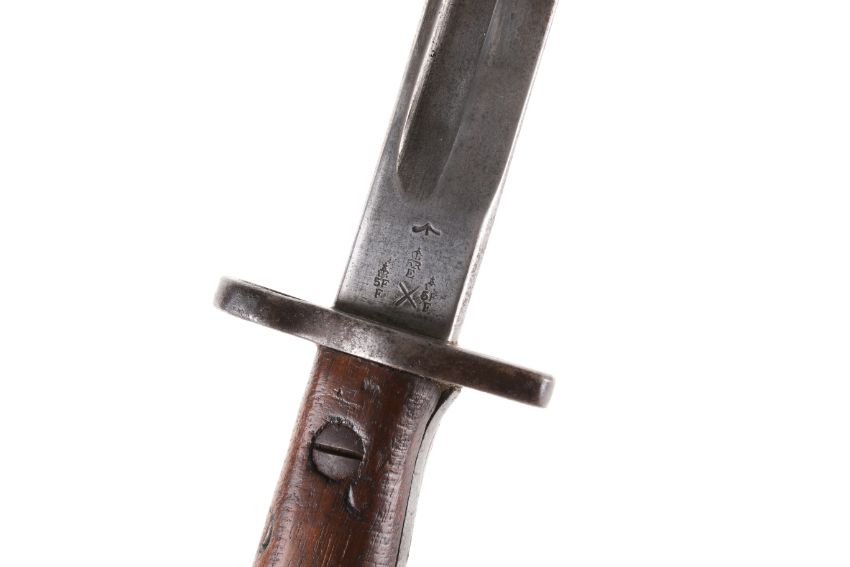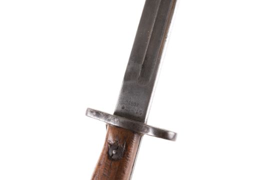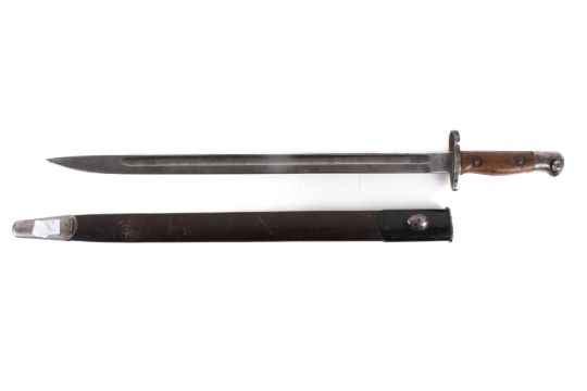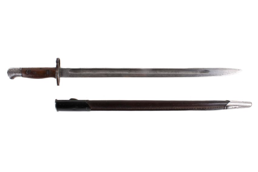 A WWI British Sanderson 1907 pattern bayonet. Dated ? 15, with military arrow, X bend-test mark, and three Royal Small Arms Factory appointed inspector’s marks. Blade L43cm. In a leather and metal mounted scabbard.