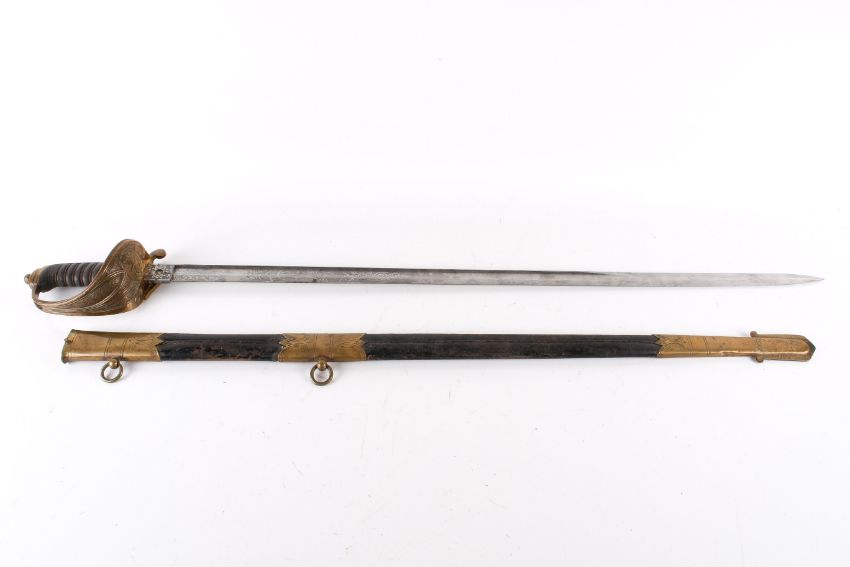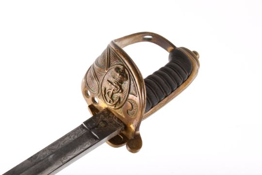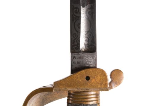 An 1827 pattern Moody of Portsmouth naval sword. With shagreen grip, naval crest to the hilt, the blade etched, L80cm, the leather scabbard with brass fittings.