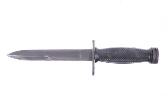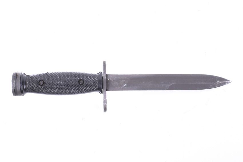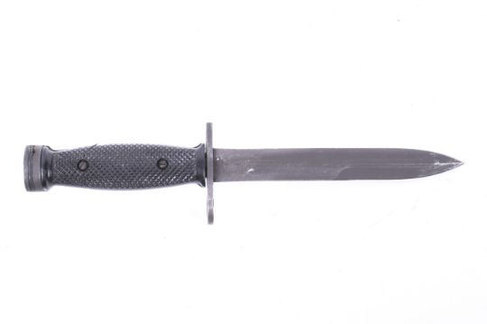 A South Korean copy of the post-war US M4 knife bayonet. Double sided blade with plastic handle, crosspiece marked K-M4 and starbust in circle. Blade L16.7cm.