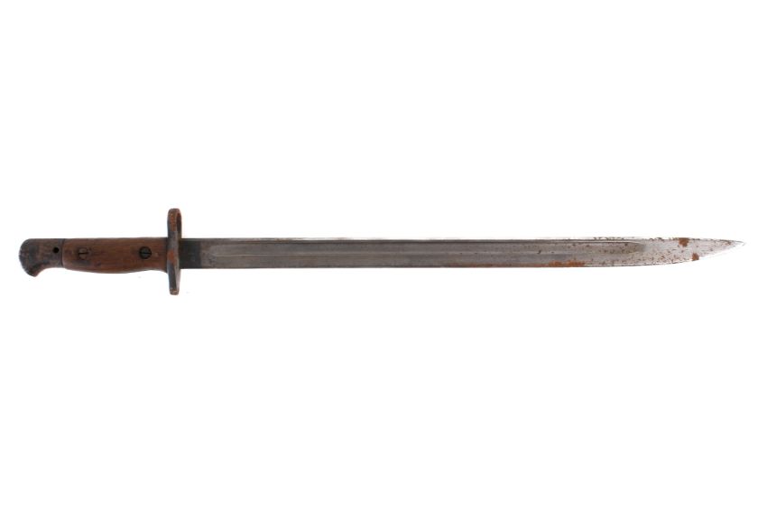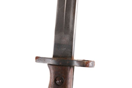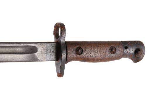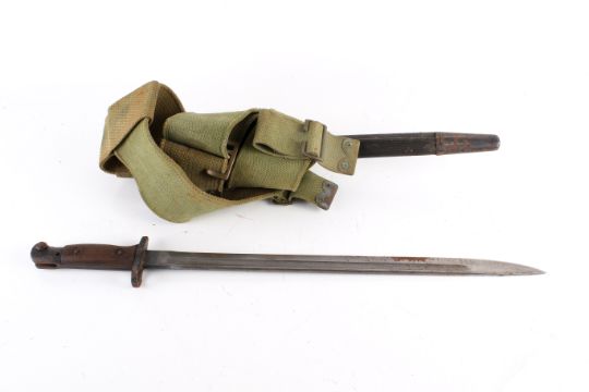 A WWI Sanderson 1907 pattern bayonet. Dated February 1918, with X bend-test mark and inspection marks. Blade L43cm, in a metal mounted leather scabbard, with canvas holdall.