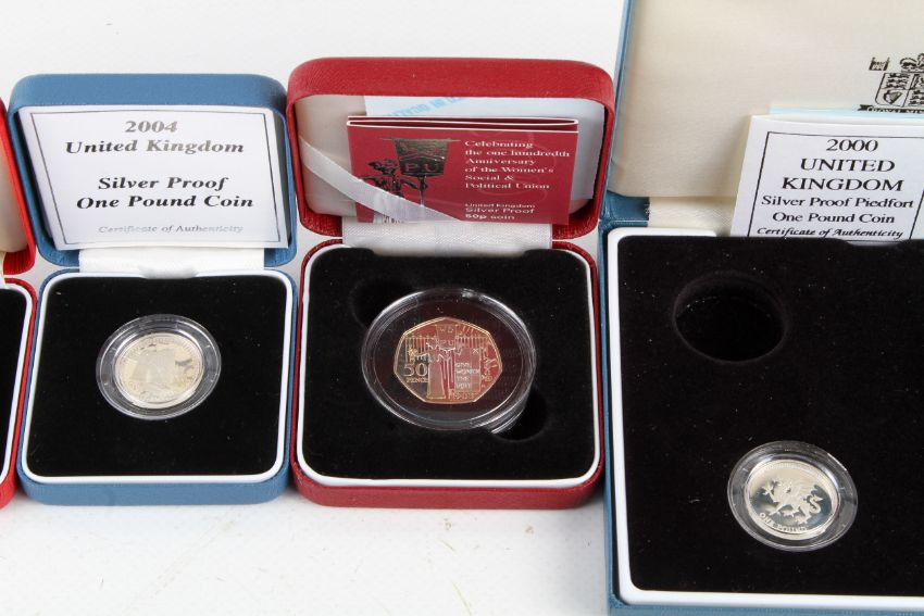 A group of seven assorted modern silver coins. Including four Piedfort 1998 50 pence and three £1 coins dated 2000, 2001 & 2008 plus three silver proof coins dated 2000, a 2004 £1 coins and 2003 50p coin.