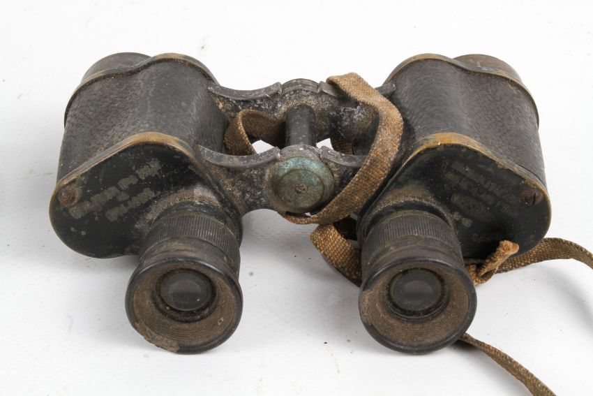 Three pairs of World War period binoculars. Two by Kershaw, one with military arrow.
