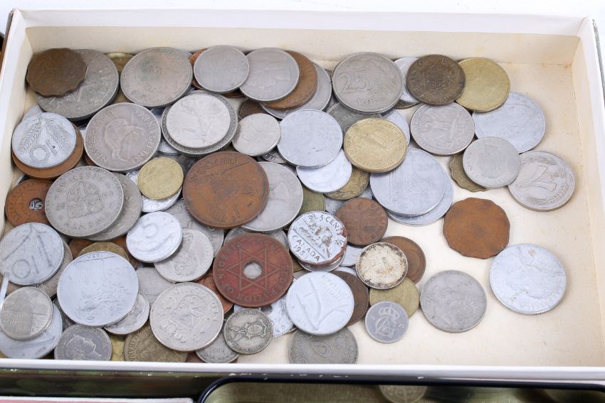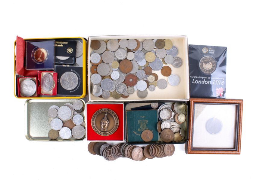 A group of 20th century world coins. Including 2012 Olympic £5 coin plus a Lagos medallion etc.