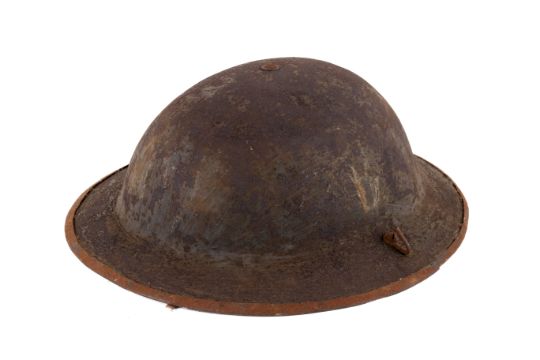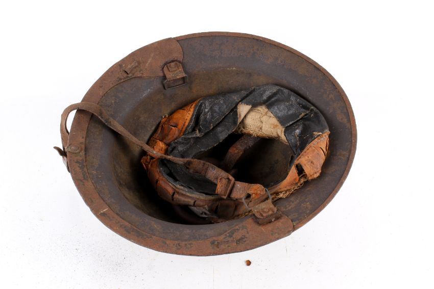 A WWII helmet. With additional reinforced rim, with liner and chin strap, and with two hooks to the top. No visible marks.