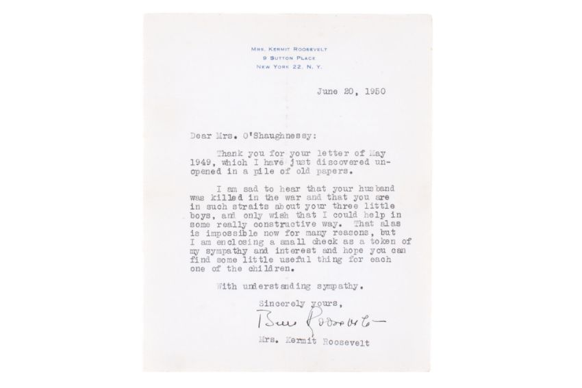 A letter from Mrs Kermit (Belle) Roosevelt to Mrs O'Shaughnessy. Dated June 20, 1950, in which Mrs Roosevelt sends her condolences on the death of Mrs O'Shaughnessy's husband in 1949. On headed notepaper and signed 'Belle Roosevelt', in a headed envelope. Belle Roosevelt was married to Kermit Roosevelt (1889-1943), son of Theodor Roosevelt, 26th President of the United States of America.