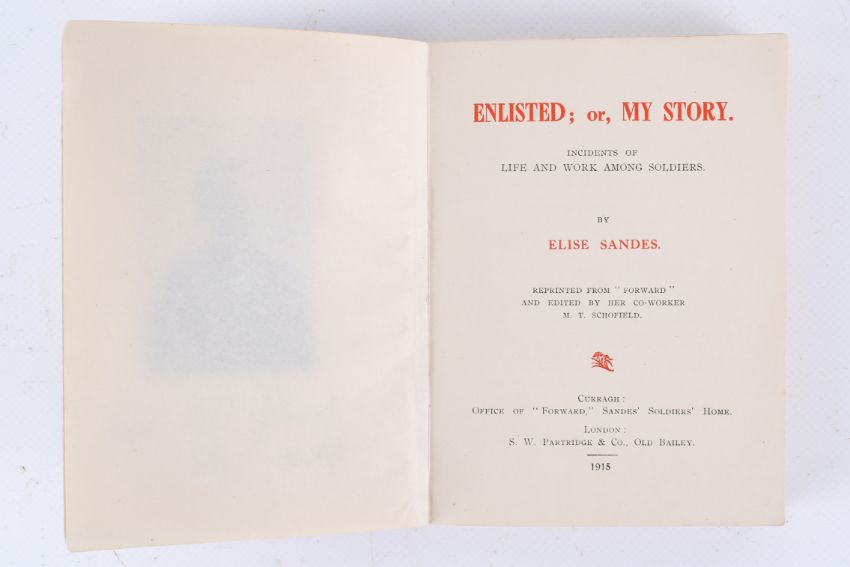Book: Elise Sandes, 'Enlisted; or, My Story. Incidents of Life and Work Among Soldiers', 1915. Reprinted from 'Forward' and edited by her co-worker M. T. Schofield, publ. SW Partridge, London.