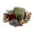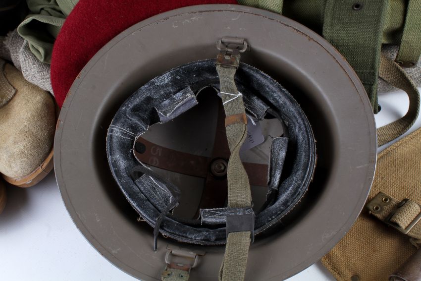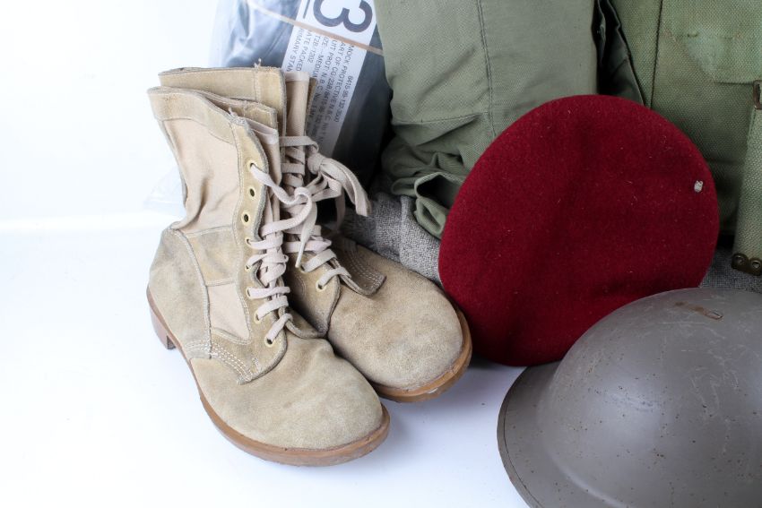 A collection of military clothing and accessories. Including a bottle holder stamped 1973, a pair of boots, a green boiler suit, further rucksack, beret, helmet and blanket, etc.