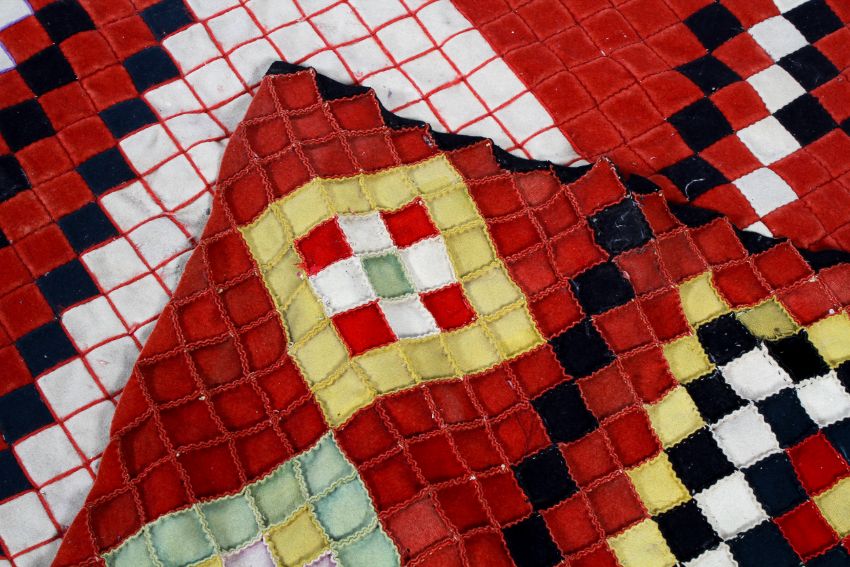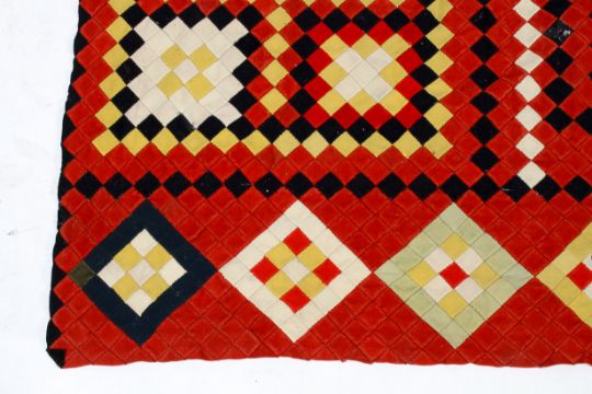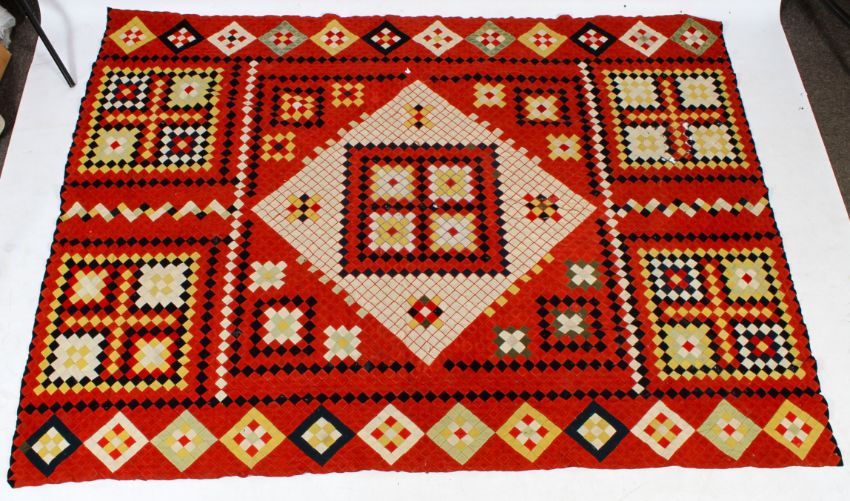 A 19th Century Military or Soldier's Quilt. Fashioned from the uniforms of soldiers who had taken part in the war, usually by injured servicemen, the presence of very bright colours (red, yellow and black) suggest it was made by soldiers present in India, 185cm x 225cmSimilar examples to be found in the V&A, American Folk Art Museum and the Stratford Perth Museum Condition Report: Moth damage mostly to the darker coloured material areas, leaving a large hole in one of the outer square sections. There is white paint spots to the back.