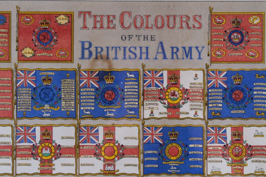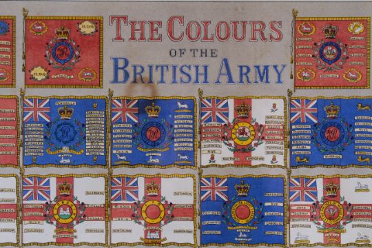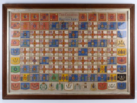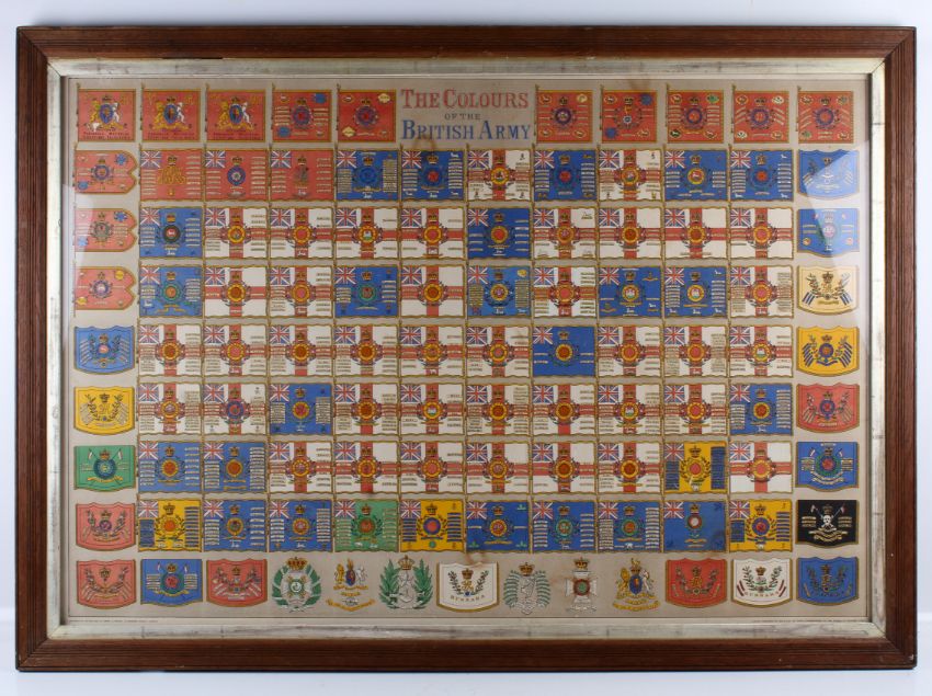 A possibly late 19th century chromolithograph of 'The Colours of the British Army'. Published by Day and Son, framed and glazed size 74cm x 100cm.