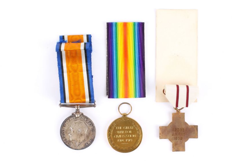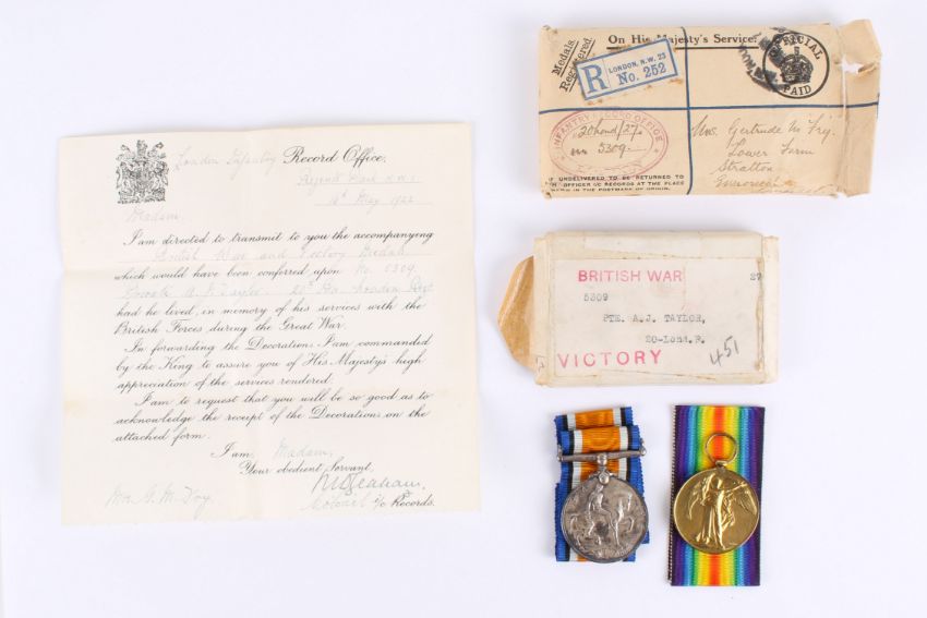 Three WWI and later medals. Comprising the WWI British War medal and Victory medal (awarded to 5309 PTE A.J. TAYLOR 20-LOND-R), with accompanying Record Office letter, and a British Red Cross Society medal (awarded to 22033 J.R. Fry, 1939),in original postage boxes and envelope.