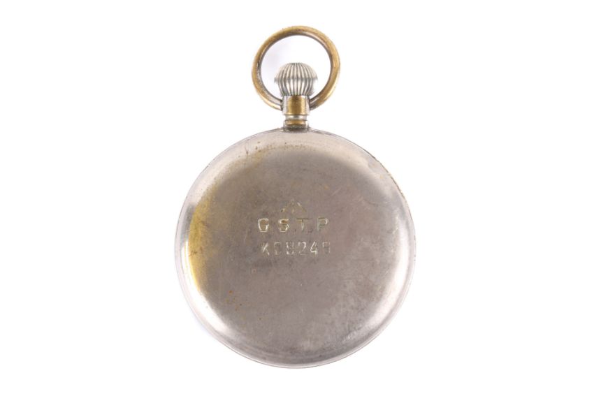 A WWII GSTP military pocket watch. With Arabic numerals and subsidiary dial, blue points to the hands, marked to the back with arrow, G.S.T.P. and K08248.
