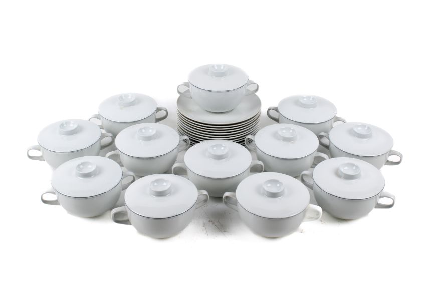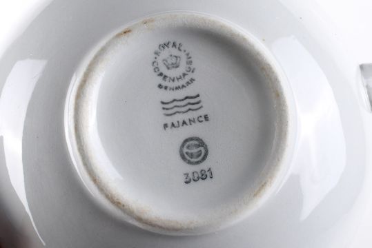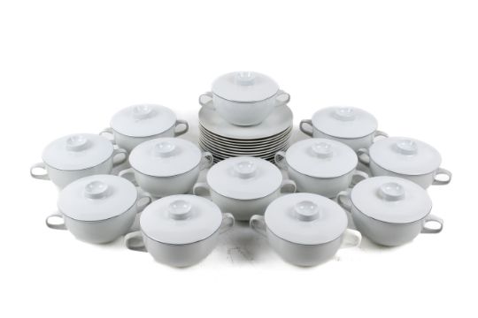 A set of Royal Copenhagen 'Fajance' soup bowls with covers and plates. Max. H7cm