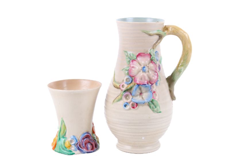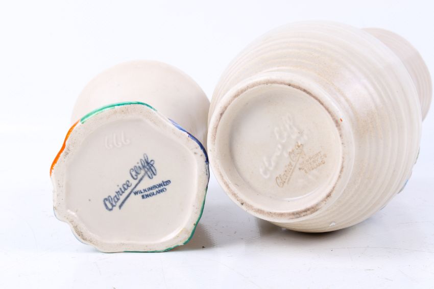 Two Clarice Cliff items. Including a Newport Pottery My Garden Series jug and a Wilkinson Ltd vase. Max. approximately H21cm