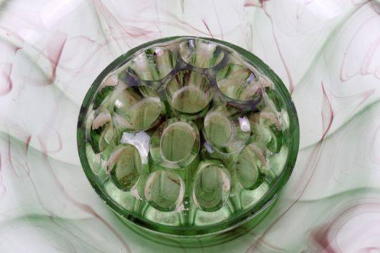 A 1930s Davidson green cloud glass bowl and frog. With swirls of brown in the glass, diameter 25cm.