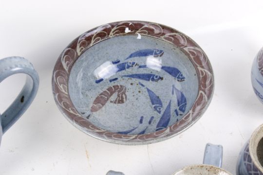 A Studio Art Pottery set of twelve mugs, a jug and a dish. With fish and octopus design. Max. H13cm