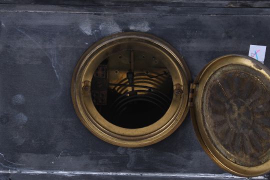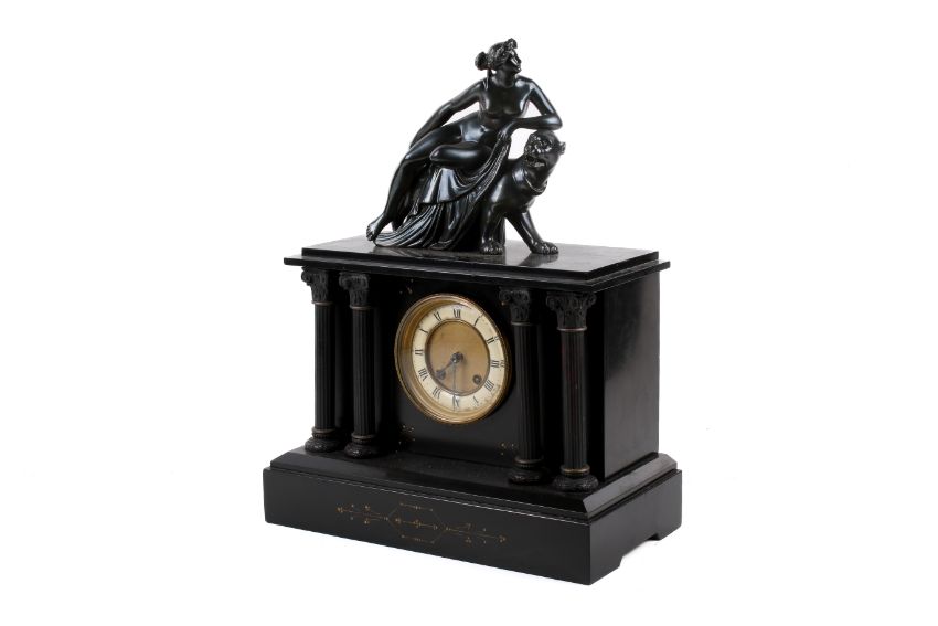A Victorian black slate mantel clock. The white ceramic and gilt dial with Roman numerals, topped with a model of a goddess and her lion and flaked by Corinthian columns, mounted on a stepped base, H46cm x W35cm x D18.5cm