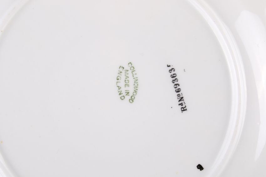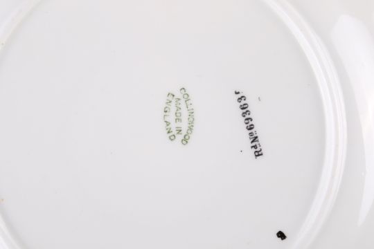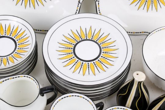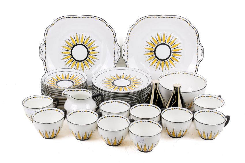 A Collingwood Art Deco tea service and a pair of vintage salt and pepper shakers. The tea service ref. 6936, including cups and saucers, plates, a bowl, cream jug and two serving plates, the shakers glazed in black and cream, Max. H12cm