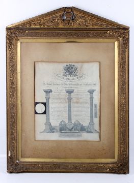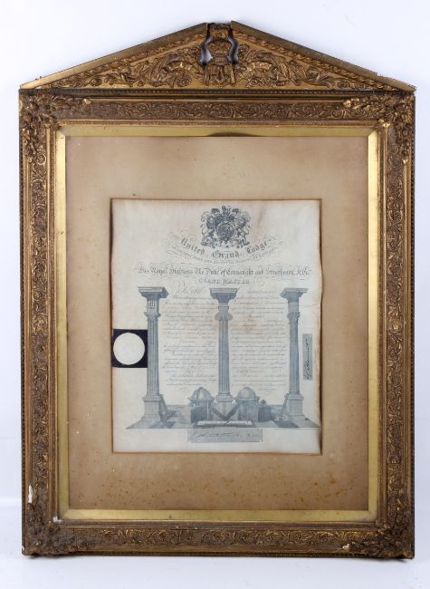 A Masonic certificate dated 1911. Mounted in a gilt frame and glazed, H74cm x W55cm.
