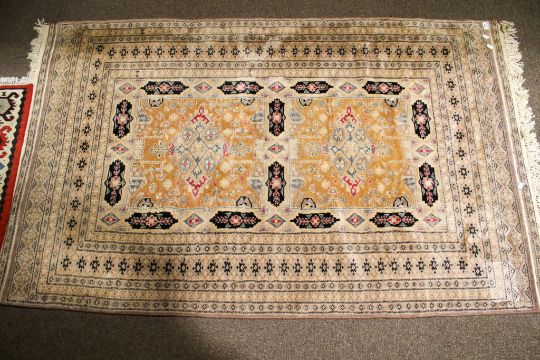 A Persian style woollen rug. Having multiple geometric borders with a pair of square central medallions with light brown ground. 196cm x 120cm