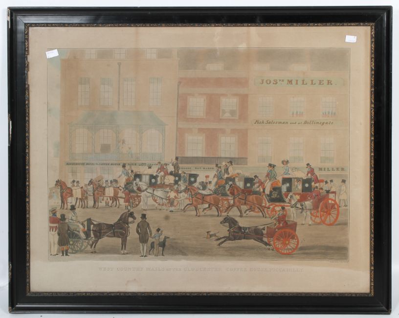 A 19th century hand coloured print of 'Mail / Stage Coaches'. 84cm x 66cm. Framed and glazed