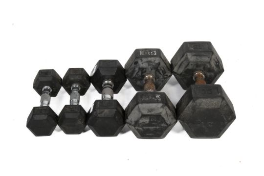 A set of five dumbbells. Including 2x 2kg, 1x 5kg, 1x 10kg & 1x 15kg.