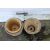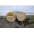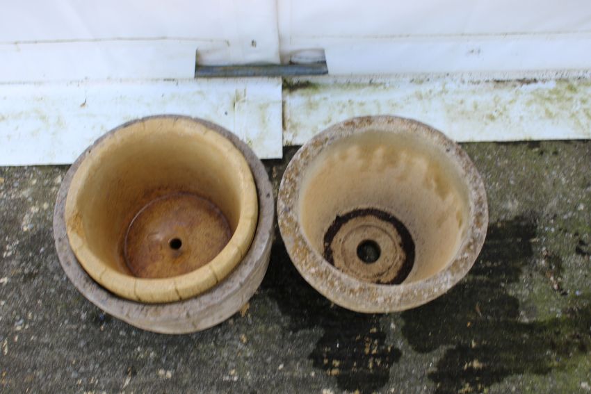 Three stone circular garden pots. Two in the form of barrels, note: two are stuck together, Max H27cm.