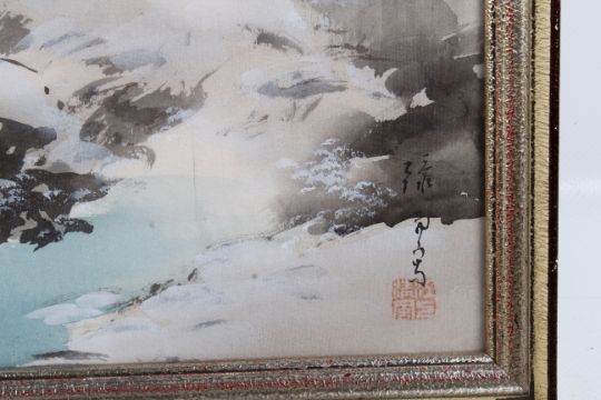 20th century, Japanese. ink and watercolour on silk, a mill wheel in winter. Signed and sealed lower right. 34.5cm x 41cm, framed and glazed.