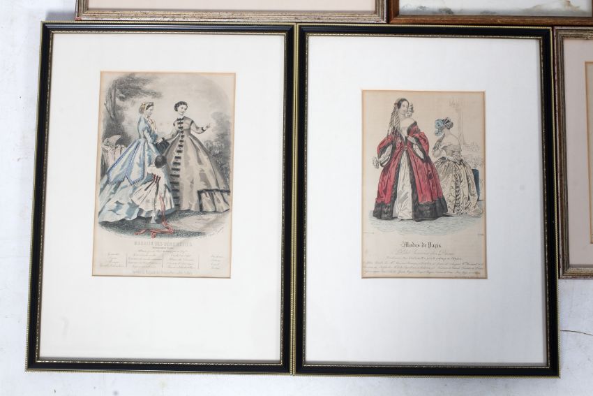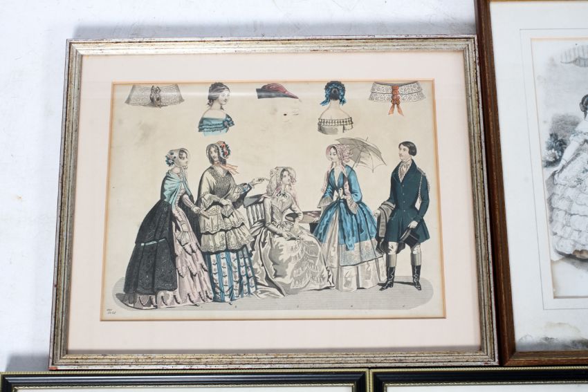 Six Victorian Ladies Fashion polychrome prints. Including 'Magasin Des Moiselles', 23cm x 15.5cm, 'Modes de Paris', 21cm x 14cm, 'Magasin Des Demoiselles', 22.5cm x 15.5cm and two others, all framed and glazed