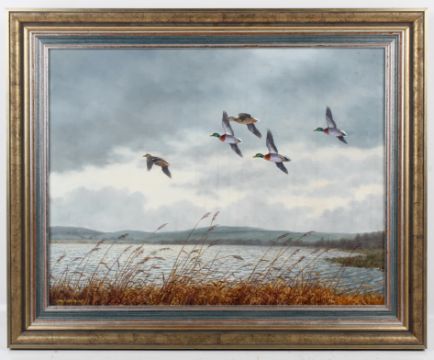 Geoffrey Campbell Black (20th Century), oil on canvas, 'Ducks in Flight'. 44cm x 35cm. Framed***This lot is being sold on behalf of Childrens Hospice South West***