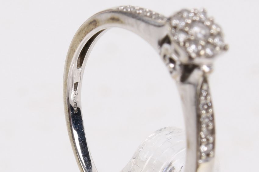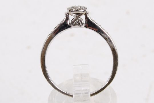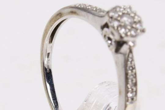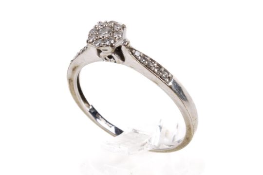 A white gold cluster ring. Set with round brilliant and single cut diamond diamonds of circa 0.21ct. Hallmarked Birmingham, gold 9ct. Size R, gross weight 2.6g.