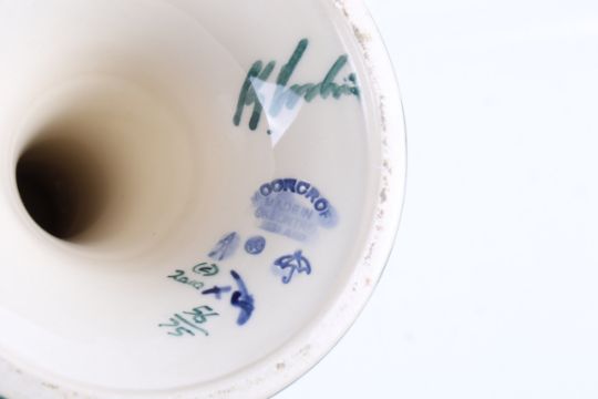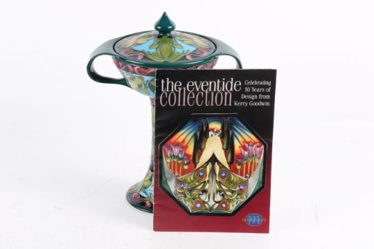 A Limited Edition Moorcroft large lidded comport. Kerry Goodwin design for 2010 Eventide Collection, the tube lined decoration in the 'Flog March' pattern, impressed mark and signature to the base, 56/75. 27cm high, with the Eventide Collection leaflet