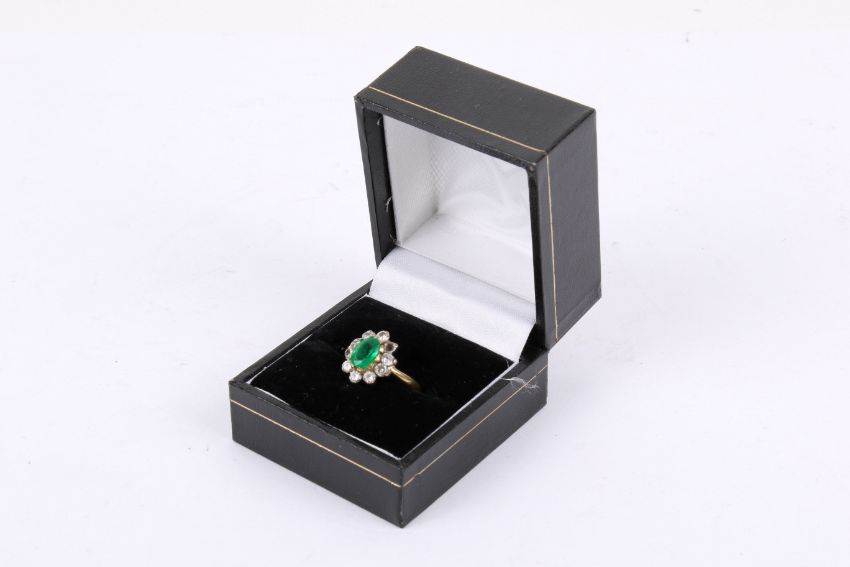 A modern 18ct gold, emerald and diamond oval cluster ring. Centred with an oval mixed-cut emerald .82ct approx, claw set in yellow within a round brilliant diamond set in white on a yellow gold D section shank with knife shoulders, post 2000 convention hallmarks, size I, 5.3g gross.