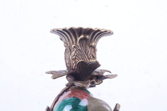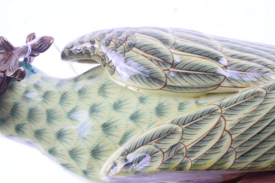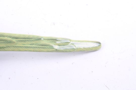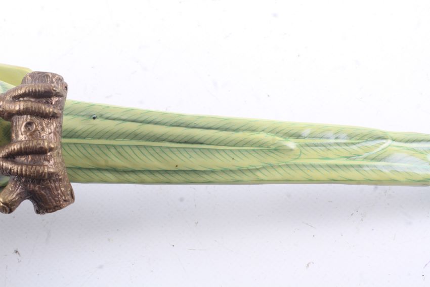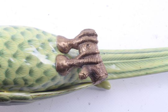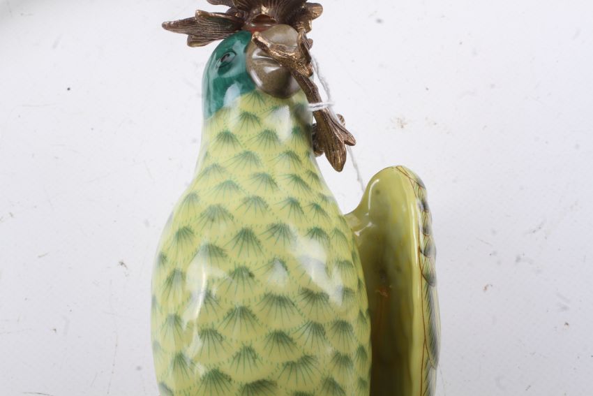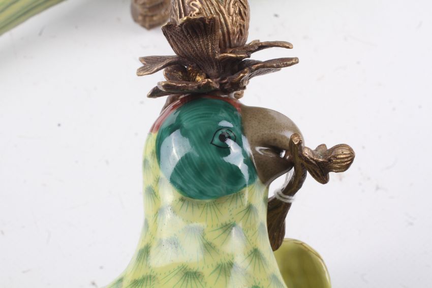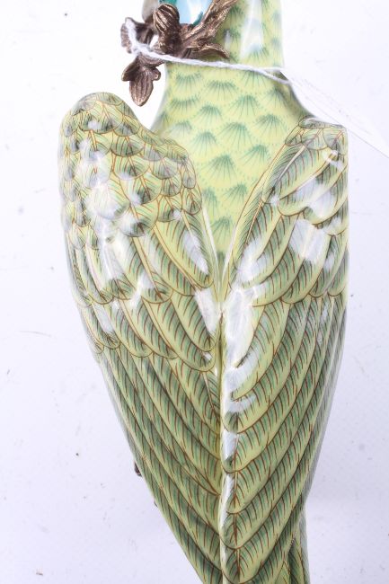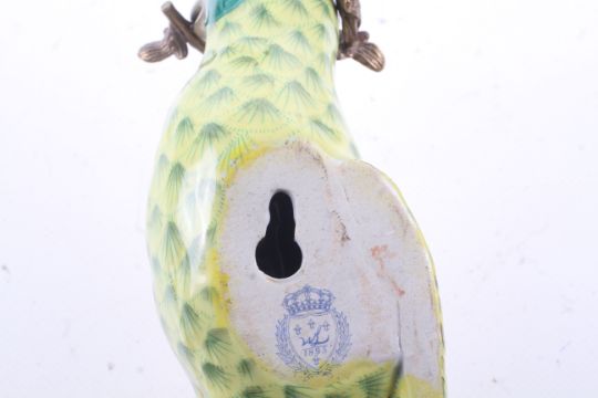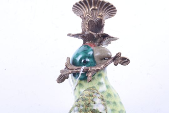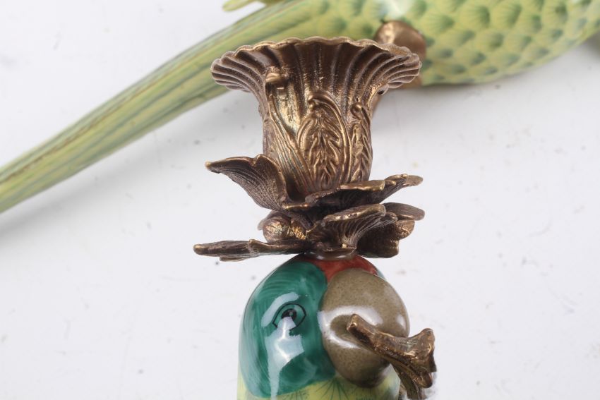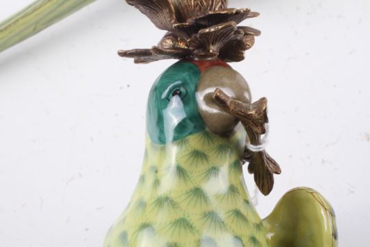 A pair of ceramic wall sconces in the form of parrots. Having green body and red stripe to the head, set perched on a brass branch with brass top, stamped 1895 to the base. H47cm
