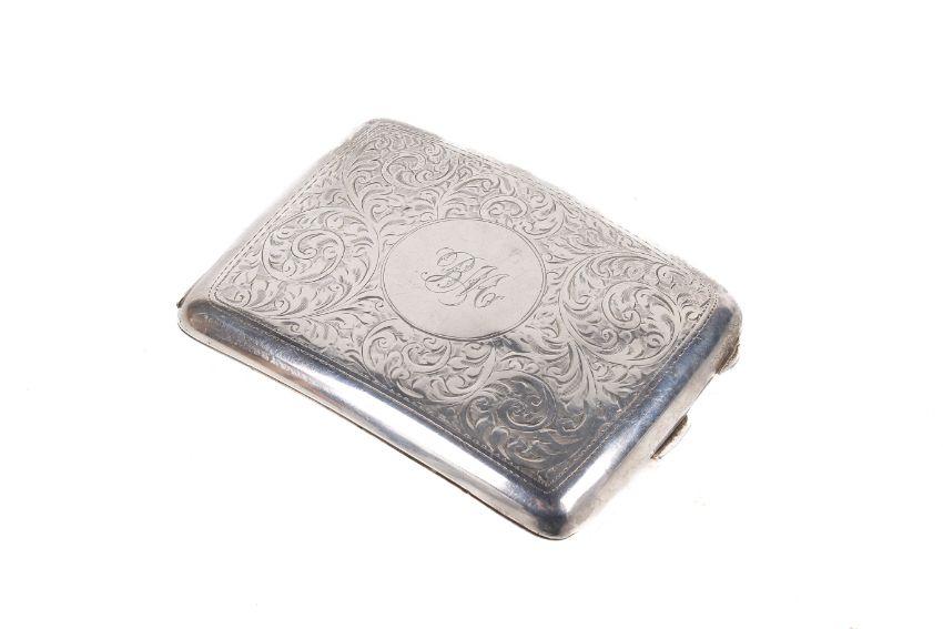 An early 20th century silver cigarette case. Of lightly convex form, engraved with scrolling leaves, with a round reserved monogram. Hallmarks for W H Haseler Ltd, Birmingham 1922. 8.4cm x 11.2cm, weight 133.6g.
